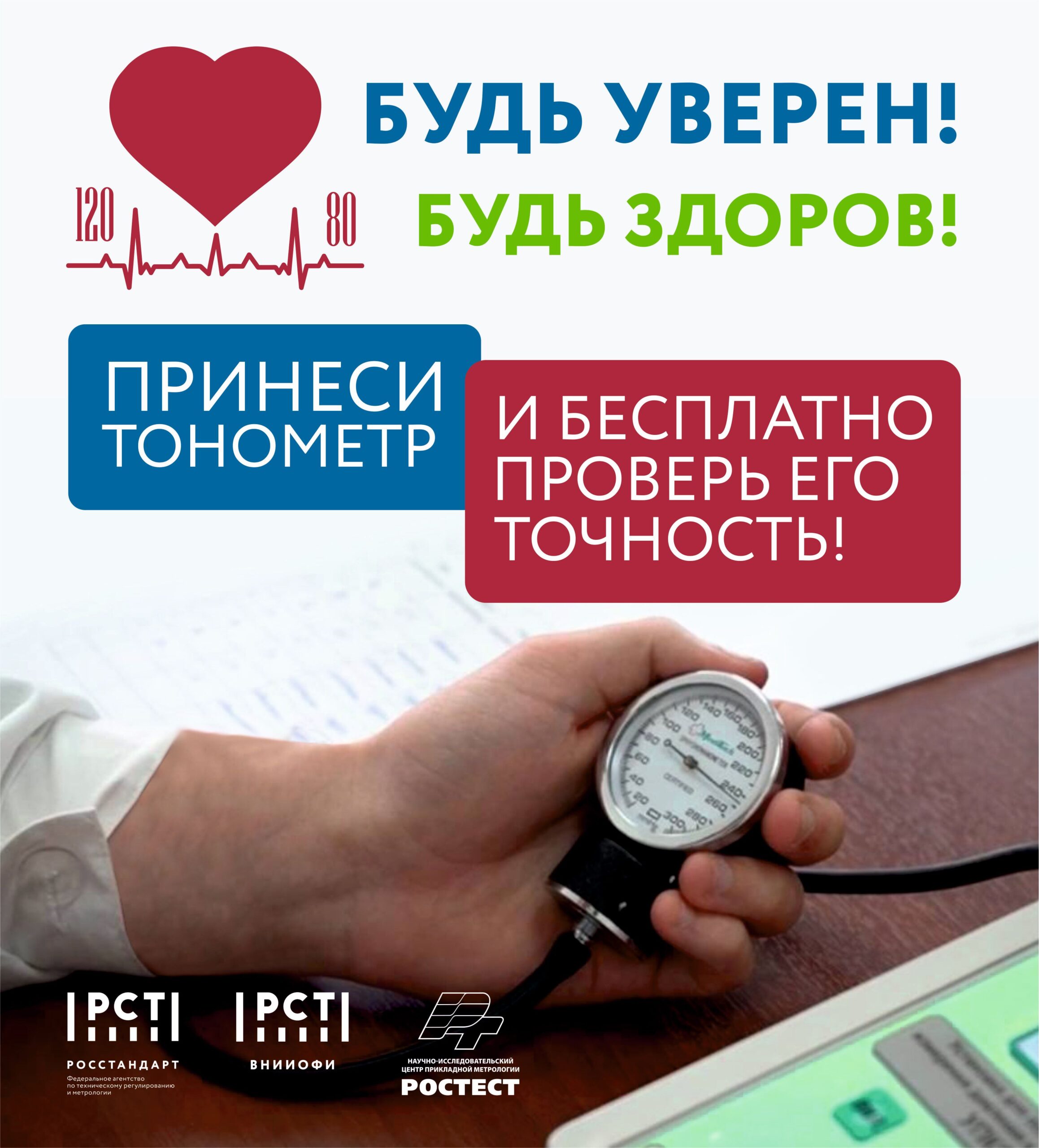Всероссийская акция «Будь уверен! Будь здоров!» проводится Росстандартом ежегодно в рамках Всемирного дня здоровья. В ходе акции специалисты подведомственных организаций проводят проверку бытовых тонометров у населения в каждом регионе нашей страны. По итогам проверки оборудования, метрологи системы Росстандарта дают не только заключение о показаниях тонометра, но и советы по устранению неисправности.