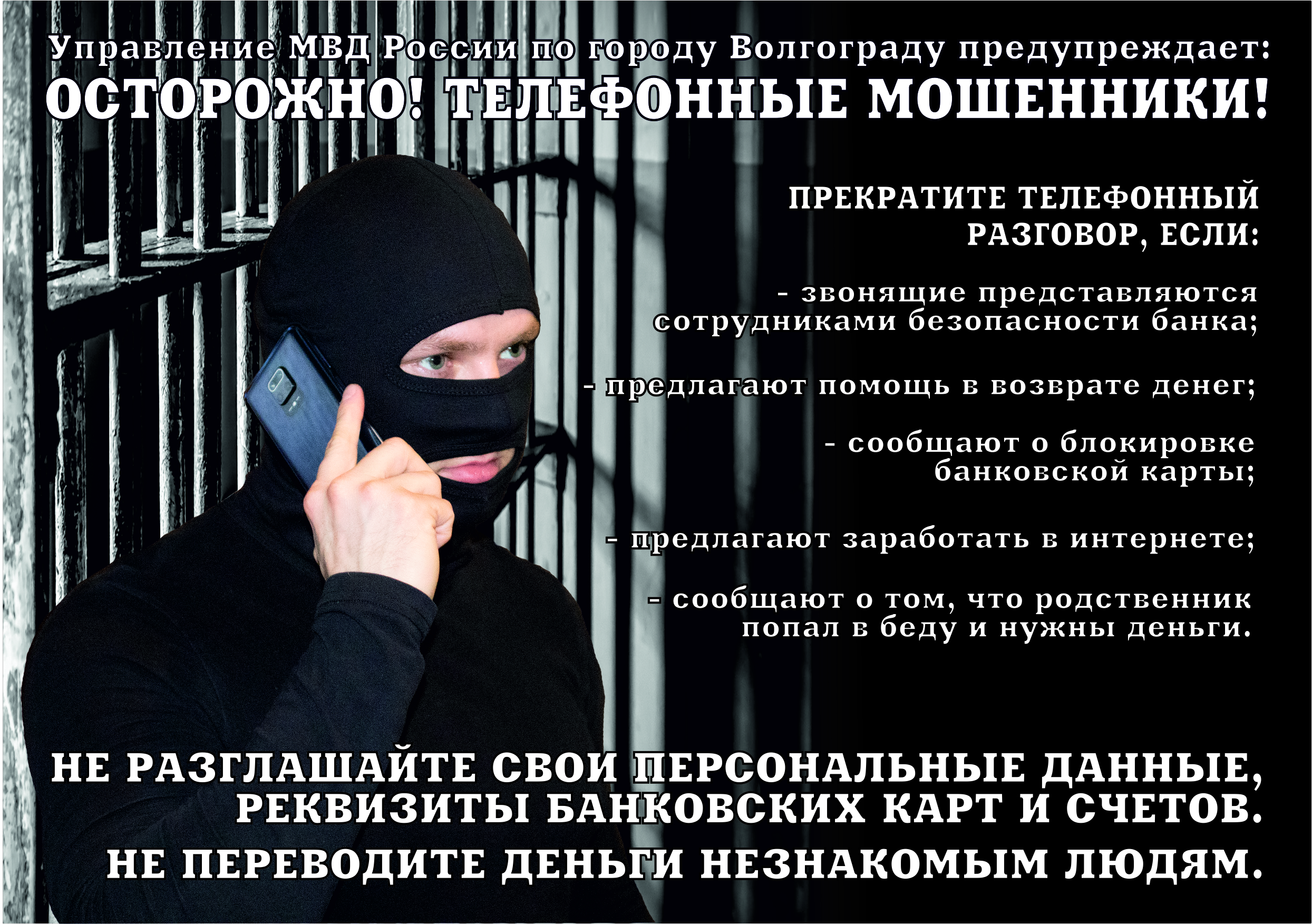 По информации ГУ МВД России по Волгоградской области ежедневно в нашем регионе регистрируются факты телефонных мошенничеств и хищений денежных средств граждан с использованием банковских карт. В целях минимизации числа таких преступлений, повышения уровня правовой грамотности населения сотрудниками полиции проводится системное информирование граждан.