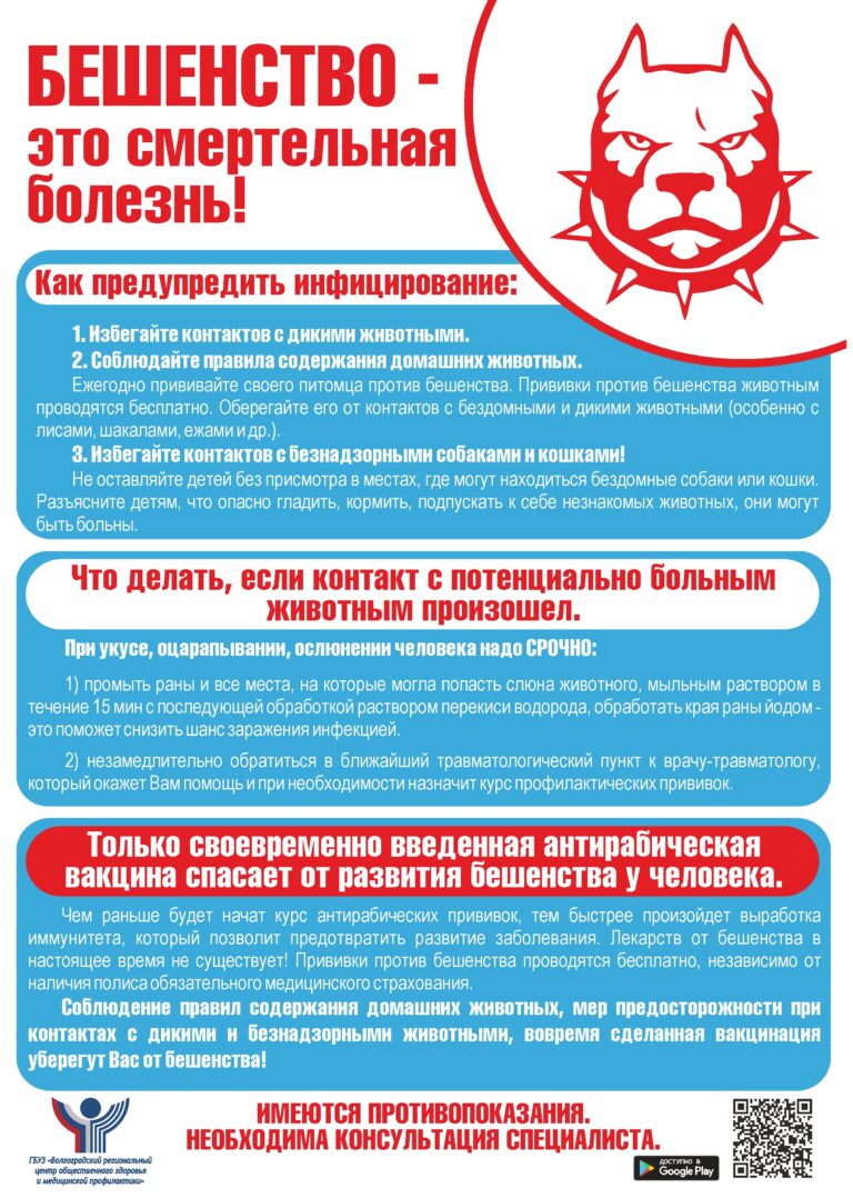 В настоящее время бешенство остается одной из важнейших проблем, как здравоохранения, так и ветеринарии. Среди инфекционных болезней бешенство (другое название — гидрофобия) занимает особое место в силу абсолютной летальности (если в первые же часы не оказать зараженному человеку необходимую помощь, он неминуемо погибнет). Возбудителем бешенства является вирус, поражающий мозг человека, который содержится в слюне больного животного. Заражение человека происходит через укусы, повреждения (раны, ссадины) на коже, реже на слизистых оболочках, ослюнения больными животными, а также при контакте с предметами, загрязненными инфицированной слюной. Особенно опасны укусы в голову, лицо, кисти рук. От человека к человеку вирус не передается.